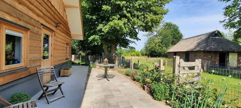 Achter de boerderij is een deel van een Sallandse kapschuur omgebouwd tot verblijfplek - De Markeboom. Op de hoek van ons terrein staat een oude eik van ongeveer 100 jaar oud. Wij denken dat dit een markeboom is. Waarschijnlijk werd deze oude eik gebruikt als richtpunt voor bewoners uit Wesepe en omstreken die langs het kerkepad naar het dichtbij gelegen katholieke klooster Sion liepen. En hieraan ontleent mijn onderneming haar naam.